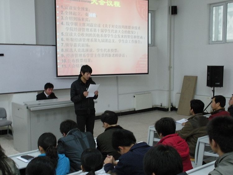 院学联主席刘磊宣读《关于对克拉玛依职业技术学院经济管理系第十届学生代表大会的批复》