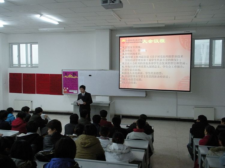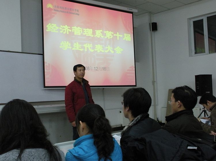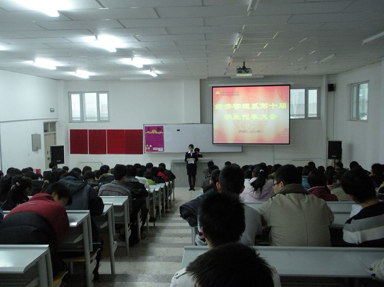 2008年12月16日,经济管理系第十届次学生代表大会在4101教室隆重举行。由全系各班选出的60 名学生代表、第九届团总支学生会委员和班主任老师本着“民主、公平、公正”的原则通过无记名投票,从45名候选人中选举产生了经济管理系第十届团总支、学生会28名委员。
