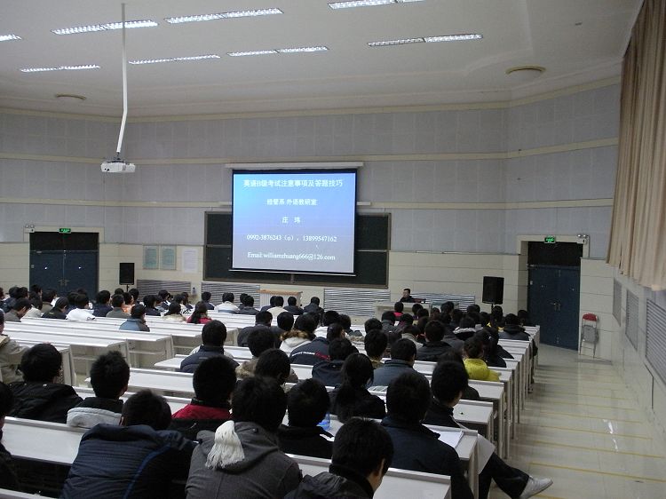 本学期英语B级考试将于12月21日(星期日)举行。为了使我院考生熟悉考试要求,规范考场纪律,准备考试所需用具和相关证件,了解考试题型,掌握考试技巧,合理分配考试时间,最大限度的获得理想成绩,经管系安排外语教研室主任庄玮老师于12月17日(周三)下午5:30至7:00在学院大报告厅为从克电大返校的07级三年制学生和克技师学院回本部的05级五年制学生做了。共有近400余名学生参与。讲座由考试时间、面向人群、考试题型、注意事项及答题技巧几个部分组成。讲座特别强调了考场纪律和答题技巧。本次讲座使即将参加B级考试的考生增强了考试意识,一定程度上也增强了考生的自信心。