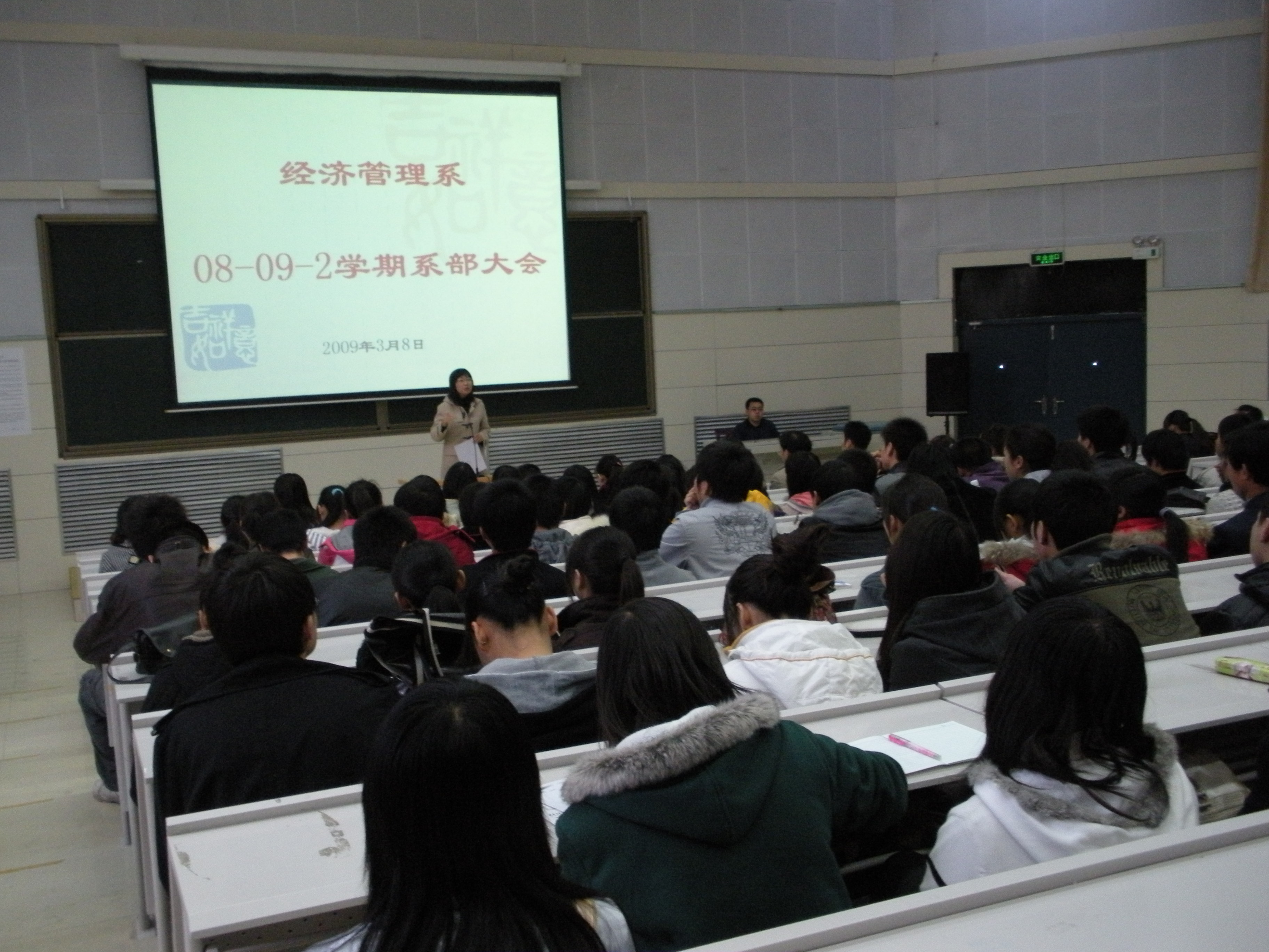 2009年3月10日17:30,经济管理系全体在校生在学院大报告厅召开系部大会,参加本次的老师有:经济管理系主任刘旭莹老师、外语教研室杨剑珍老师、酒店0451班班主任张登新老师、经管0451班班主任陈勇老师、酒店0631班班主任高琪老师、旅英0631班班主任徐新民老师、旅英0731班班主任冯娜老师、酒店0731班班主任艾山老师、商务0731班班主任孙印老师、酒店0831班班主任斯琴高娃老师,本次会议由系部辅导员张大成老师主持。