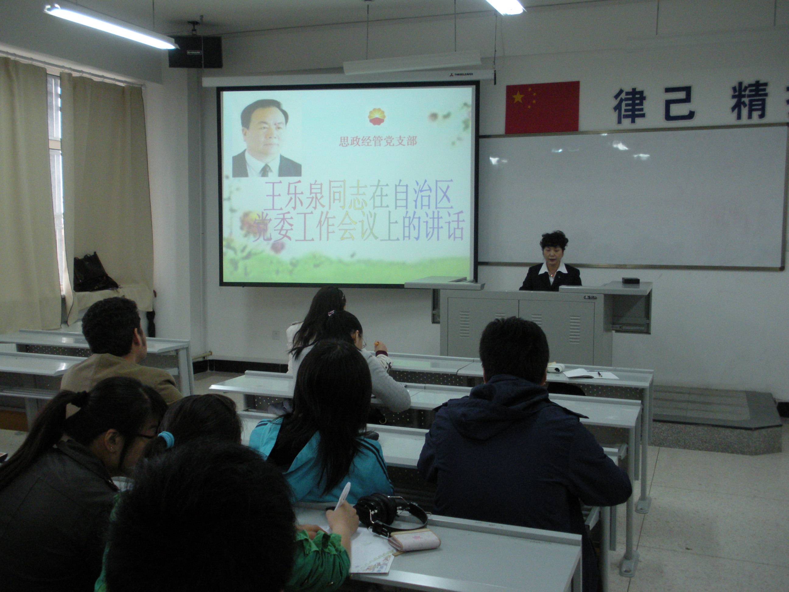 本次学习活动在一首歌曲《我们的共和国》中拉开序幕,吴生玲老师带领大家共同学习了《王乐泉同志在自治区党委工作会议上的讲话》,分别从经济、社会保障等7个方面并且结合实际开展了学习。最后观看了刘洪明教授的讲座《金融危机下的企业谋略》。学习过程中大家认真做了笔记。最后,思政经管党支部书记再次强调了学习要求,并且鼓励大家积极开展自学活动并且做好学习笔记。