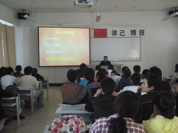 2009年5月8日18:00,经济管理系在4117教室召开08-09-2学期实习生动员大会,出席本次动员大会的有系主任刘旭莹老师,旅游教研室袁洪渝老师、黄桂青老师、艾山老师,杨剑珍老师以及系部辅导员张大成老师。经济管理系本学期参加实习学生为酒店0551和酒店0731的共计63名同学,实习地点是分布在乌鲁木齐市的4个五星级酒店。