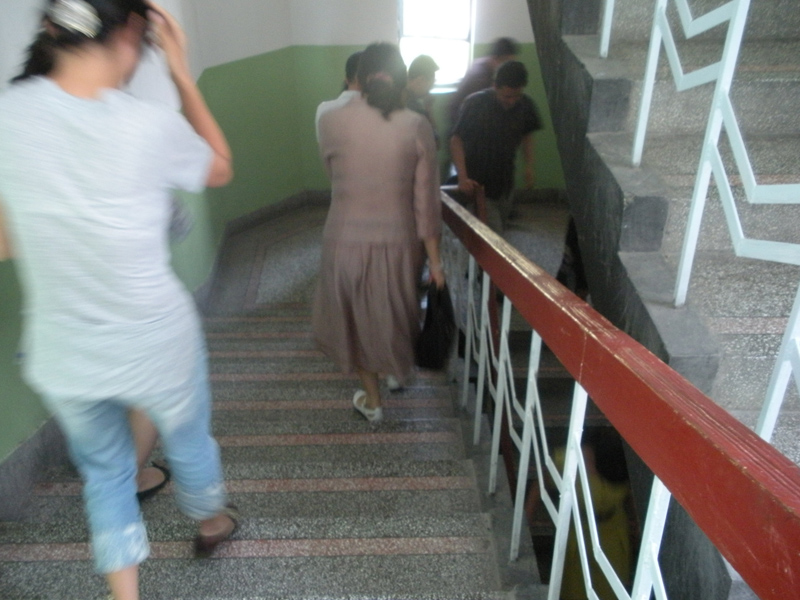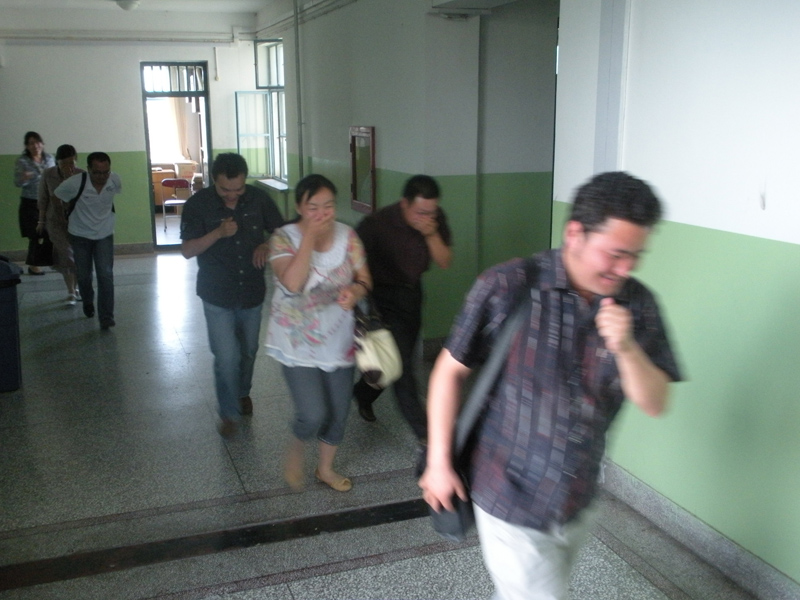 当天下午19时,随着急促的哨声响起,模拟演练正式开始。正在办公室办公的教职工按照火灾逃生预案立刻用手帕掩住口鼻并且按照已经设计好的路线经由各个逃生通道紧张有序地向下疏散,逃出教学楼后,在指定的空地集合。
