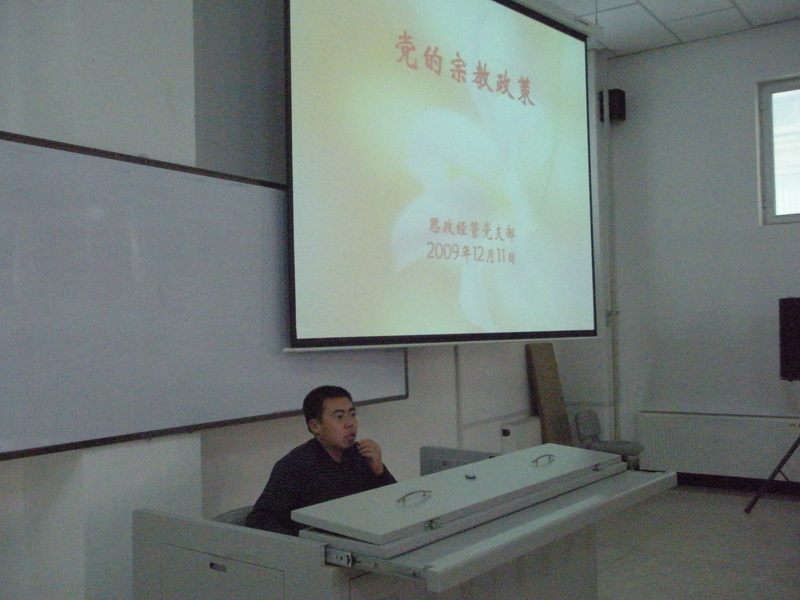 按照支部安排思政经管党支部于2009年12月10日在4101教室开展党课学习活动。参加本次党课学习的包括教师党员和申请入党教师、学生党员和入党积极分子共计81日。本次党课由思政经管党支部宣传委员兼青年委员张大成老师主讲,讲授内容为《党的宗教政策》,由党支部书记景四新老师主持。
