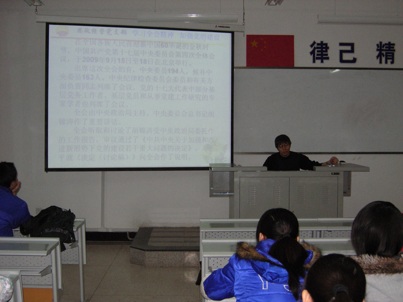 2009年12月18日,思政经管党支部在4117教室开展本学期最后一次党课学习活动,参加本次党课学习的包括教师党员和申请入党教师、学生党员和入党积极分子共计69人。本次党课由思政部付建友老师主讲,讲授内容为《十七届四中全会精神》,最后观看了视频《四中全会 看中国走向》。本次党课由党支部书记景四新老师主持。