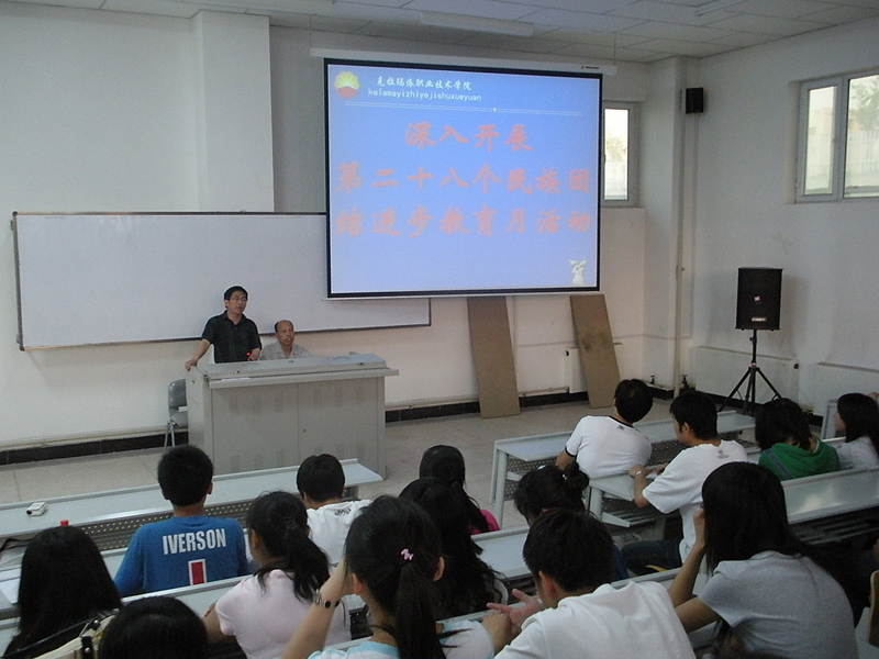 今年五月是自治区第28个、克拉玛依市第29个民族团结进步教育月活动。按照本学期工作计划经济管理系于2010年5月30日21:30在4101教室召开了系部主题班会——民族团结讲座。本次活动邀请了学院驾校党支部书记邰德育老师为大家做了精彩讲座。活动有经济管理系学管主任刘新生主持。经济管理系全体学生和班主任参加了本次活动。