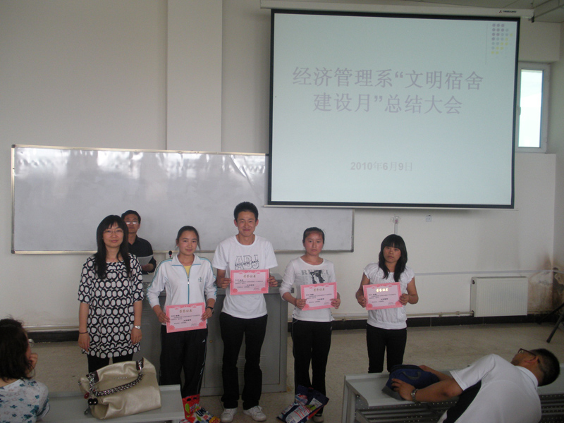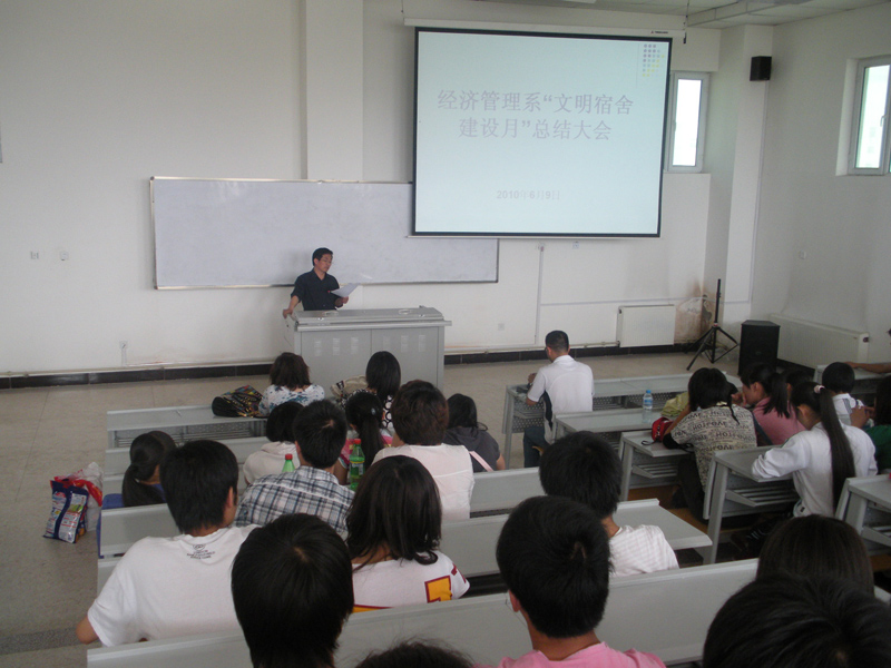 经过一个月紧张而有序的开展,由经济管理系团总支主办,以创建文明、整洁、安全、舒适、和谐的宿舍文化氛围为目标的“文明宿舍建设月”活动于5月底圆满结束。于2010年6月9日下午在4401教室召开总结大会。