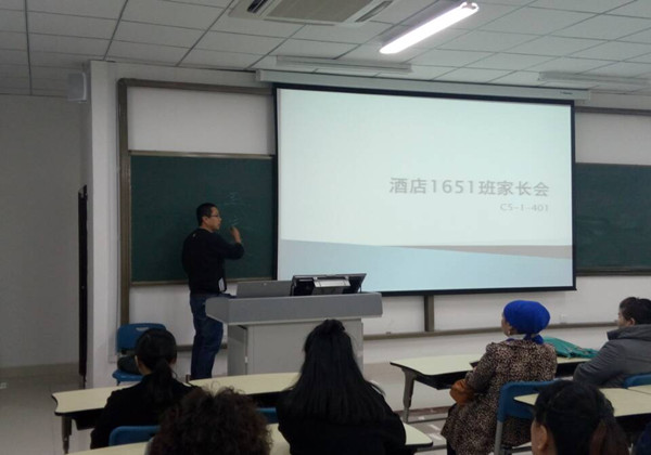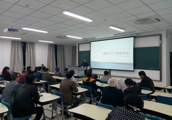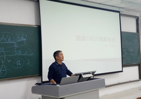 2016年10月19日晚8点,经济管理系酒店1651班新生家长会在C5楼401举行,经济管理系主任刘新生老师、新生班主任郭强老师和酒店1651班全体学生及家长参加了会议。