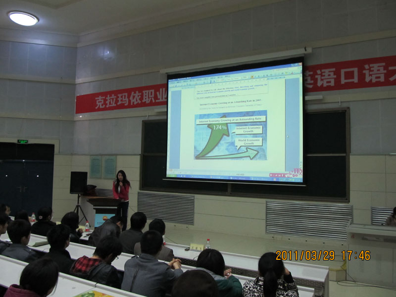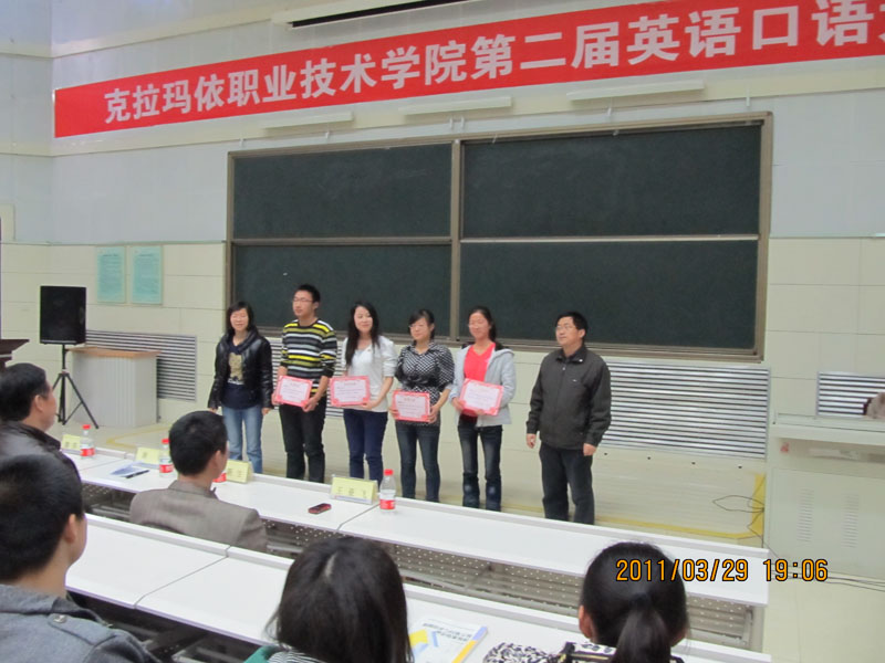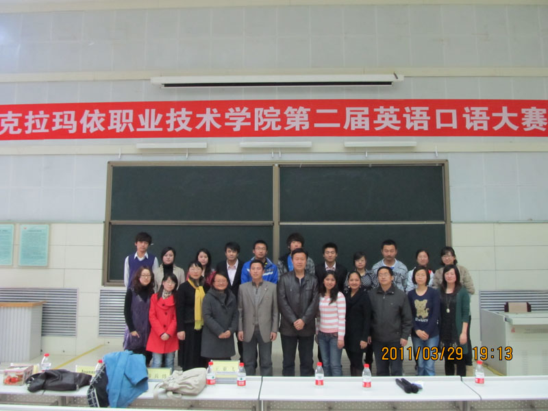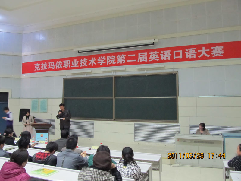 为了提高我院学生的英语口语交际及应用能力,丰富同学们的课余生活,2011年3月29日下午,由学院团委、教务处及经济管理系共同主办,信息中心协助,外语教研室承办的克拉玛依职业技术学院第二届英语口语大赛,在学院大报告厅成功举办。