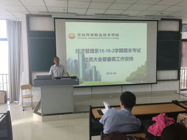 经济管理系2016年6月21日下午6:30在c7一区101教室召开了系部15-16-2学期期末考试动员大会暨暑假工作安排会议。会议由经济管理系主任刘新生老师主持,各班班主任和全体学生干部、学生代表参会。