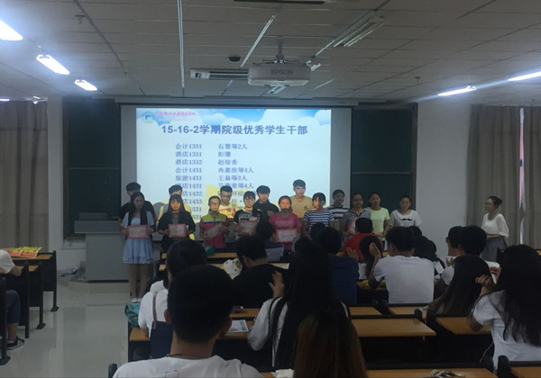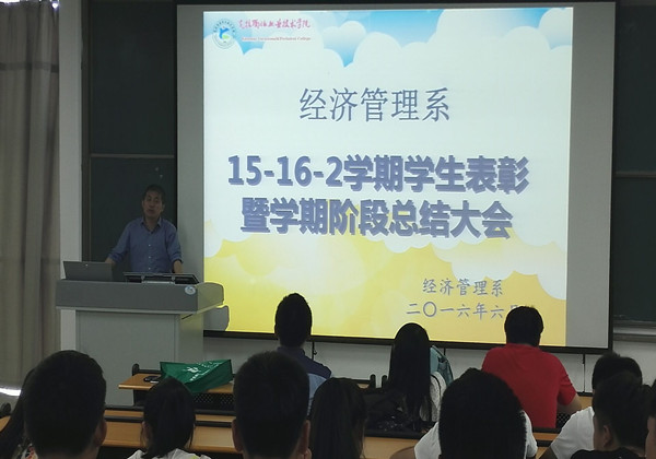 6月1日下午,在C7一区201教室经济管理系召开15-16-2学期学生表彰暨学期阶段总结大会,出席本次表彰大会的有经济管理系主任刘新生老师、团总支书记马芮老师、辅导员胡文老师和各班班主任。