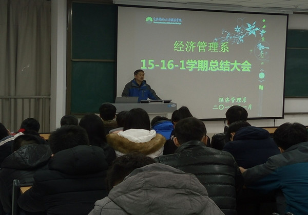 1月10日晚21点整,经济管理系全体在校学生在C7教学楼Ⅰ区101教室举行了本学期期末总结大会,经济管理系辅导员胡文老师主持了本次会议,经济管理系主任刘新生老师、团支部书记马芮老师以及各班班主任出席此次会议。