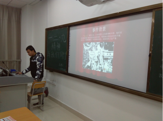 2015年12月9日下午3时许,在C7教学楼Ⅱ区102教室内由经济管理系旅游1431班的同学们开展了“纪念12.9,12.9精神与我们同行”主题团课。在团课进行中,我们通过同学们提供的文字资料,明白了当时的社会、历史背景并清晰的明白了12.9爱国运动的过程。在观看12.9爱国运动的历史视频资料的时候,我们看到了那个年代的青年为我们的国家,为我们现在所生活的这片土地所奋起的勇气与热血。为了爱国和保卫我国领土主权,在当时的执政政府的压迫下,在棍棒和喝骂下,在血与泪下,中国的青年没有屈服!在面对抉择,苟且偷生还是奋勇向前的时候,他们挺身而出,用自己的满腔热血,用自己的血肉,用自己的呐喊,用自己所有的能量,呼吁全中国的人民觉醒。让我们感触很深。