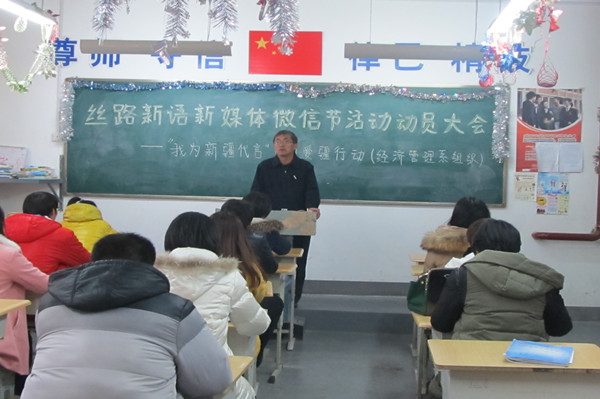 会上,刘主任号召同学们加入“丝路新语”这个全新的、年轻的平台,并积极参加此次微信节的相关活动,通过此次微信节打开新疆大学生的一片天空。同时,我系团支部书记胡文老师对我系组织的“我为新疆代言”爱国爱疆行动进行详细活动说明,包括其参与方式、评选方法和奖品介绍。最后,刘主任希望通过大家的力量将此次活动宣传到校园的每一个角落,并且同时表达了对各个兄弟系部学生会干部支持的感谢。
