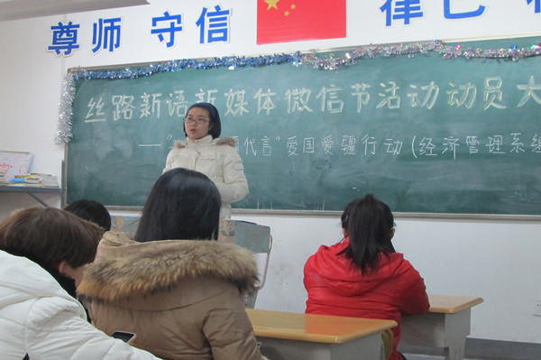 2014年12月10日下午五点三十分,经济管理系在2104教室组织召开“丝路新语”新媒体微信节活动动员大会,大会由经济管理系主任刘新生老师主持,经济管理系各班班主任、学生会干部、各班班长、各班团支书、各系部学生会主席、及文宣部部长参会。
